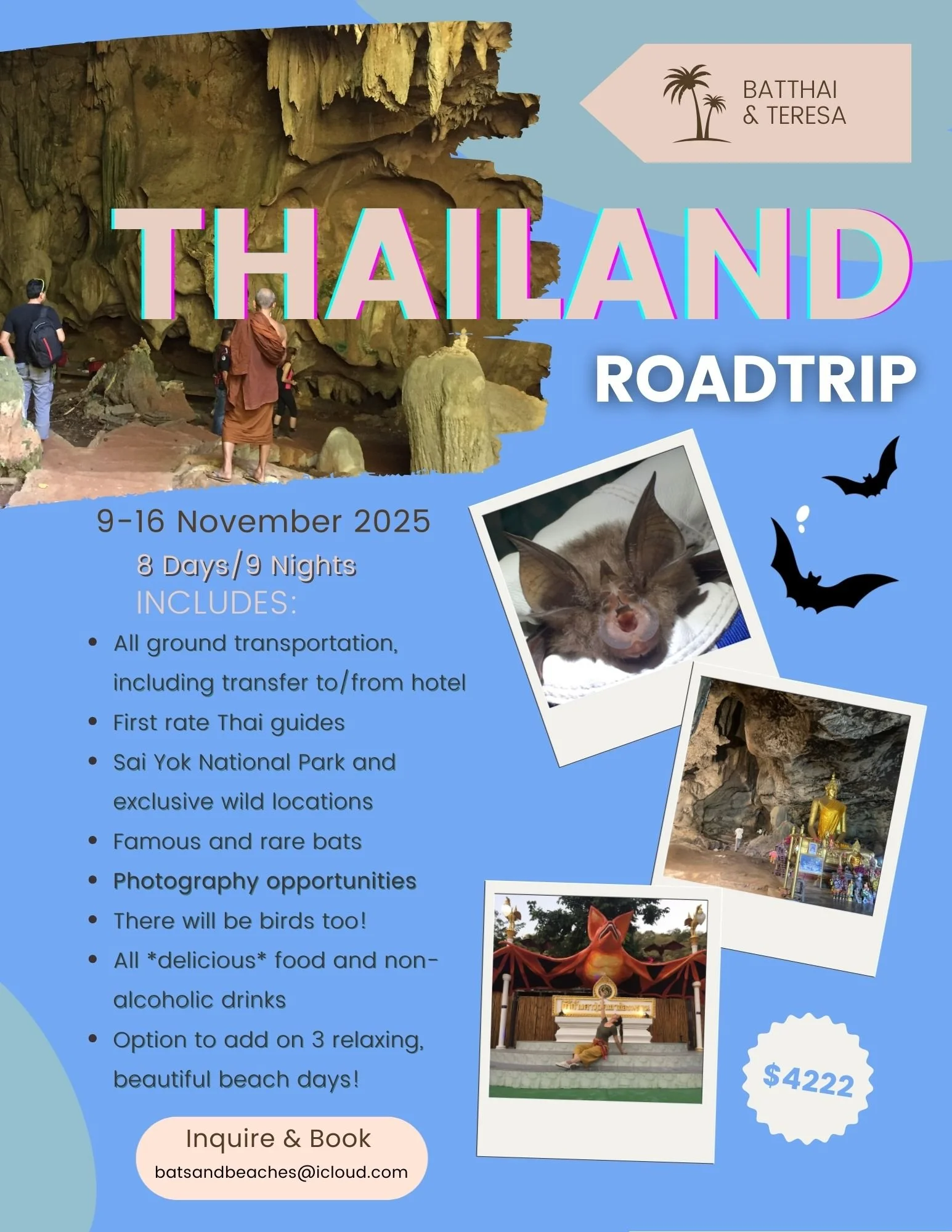 The bats will lead the way as our Thai guides drive us to visit six Thai provinces by Batmobile (read as, van): Bangkok, Khon Kaen, Ang Thong, Kanchanaburi, Ratchaburi, and Surat Thani. Email for the itinerary!